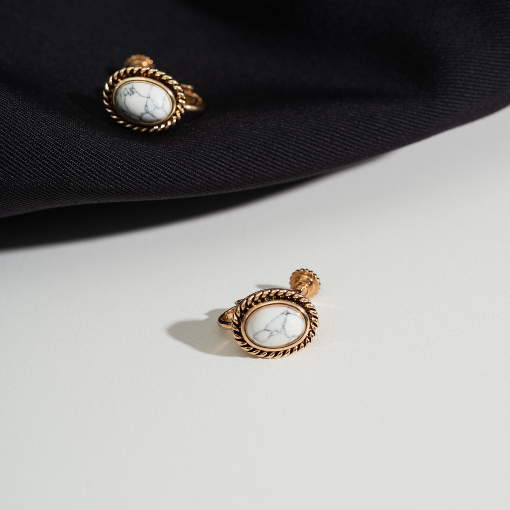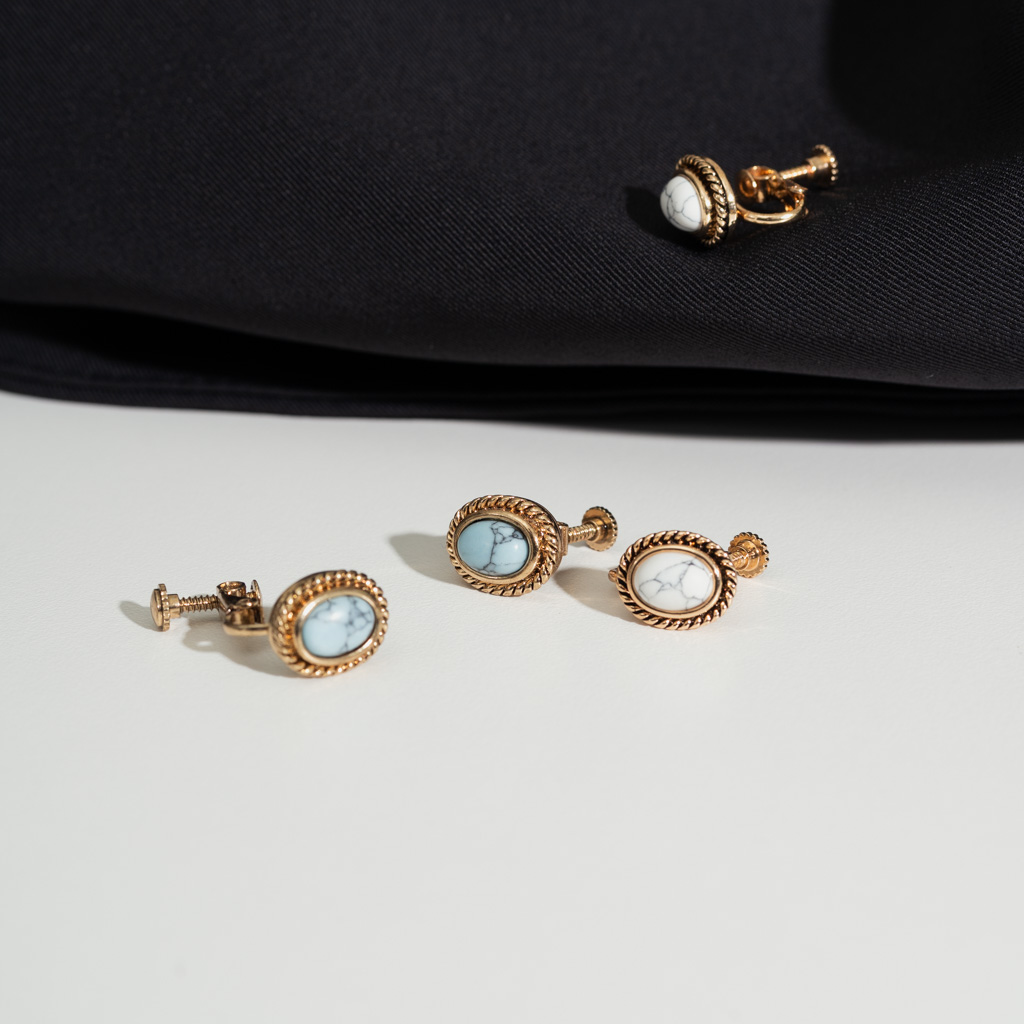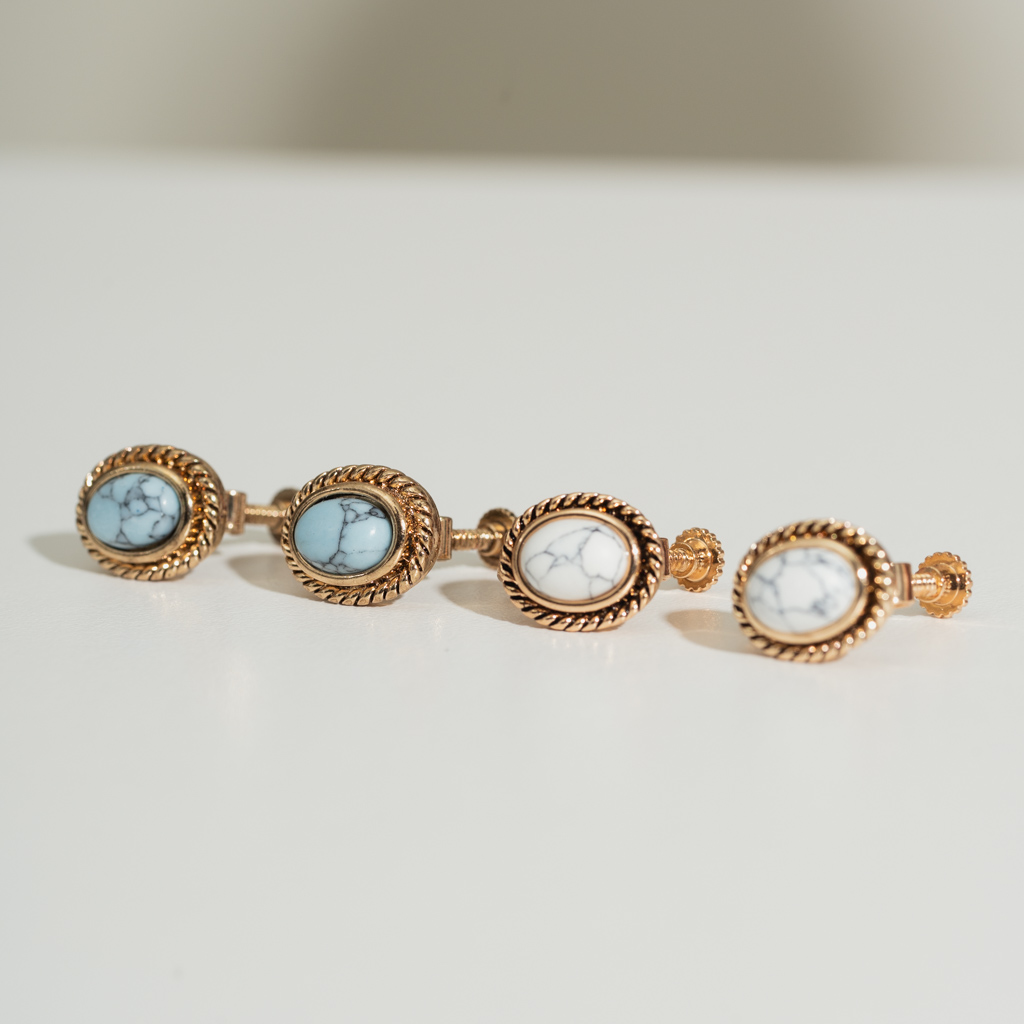 復古麻花大理石紋.螺旋夾式耳環 -白色/藍色