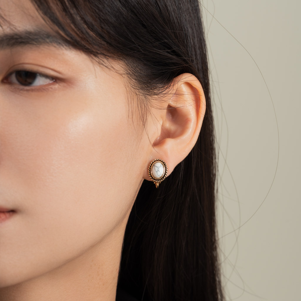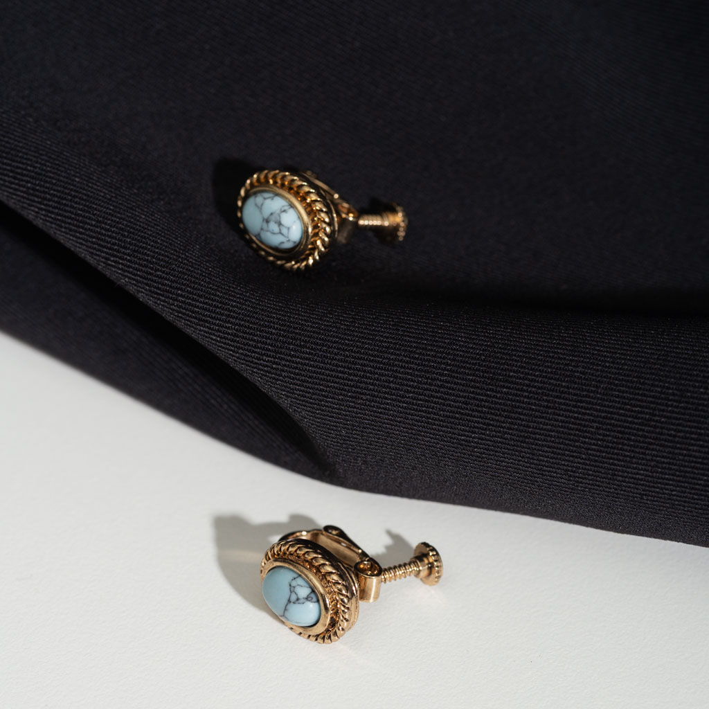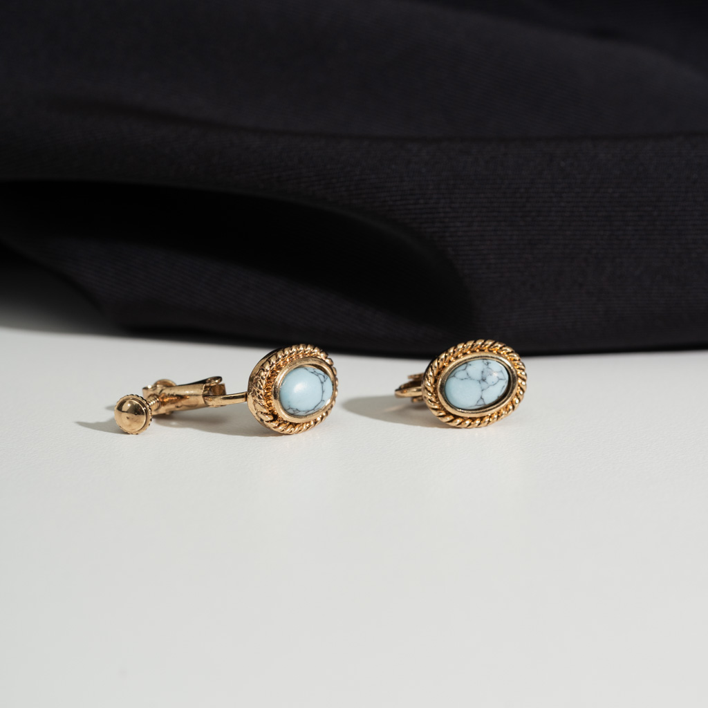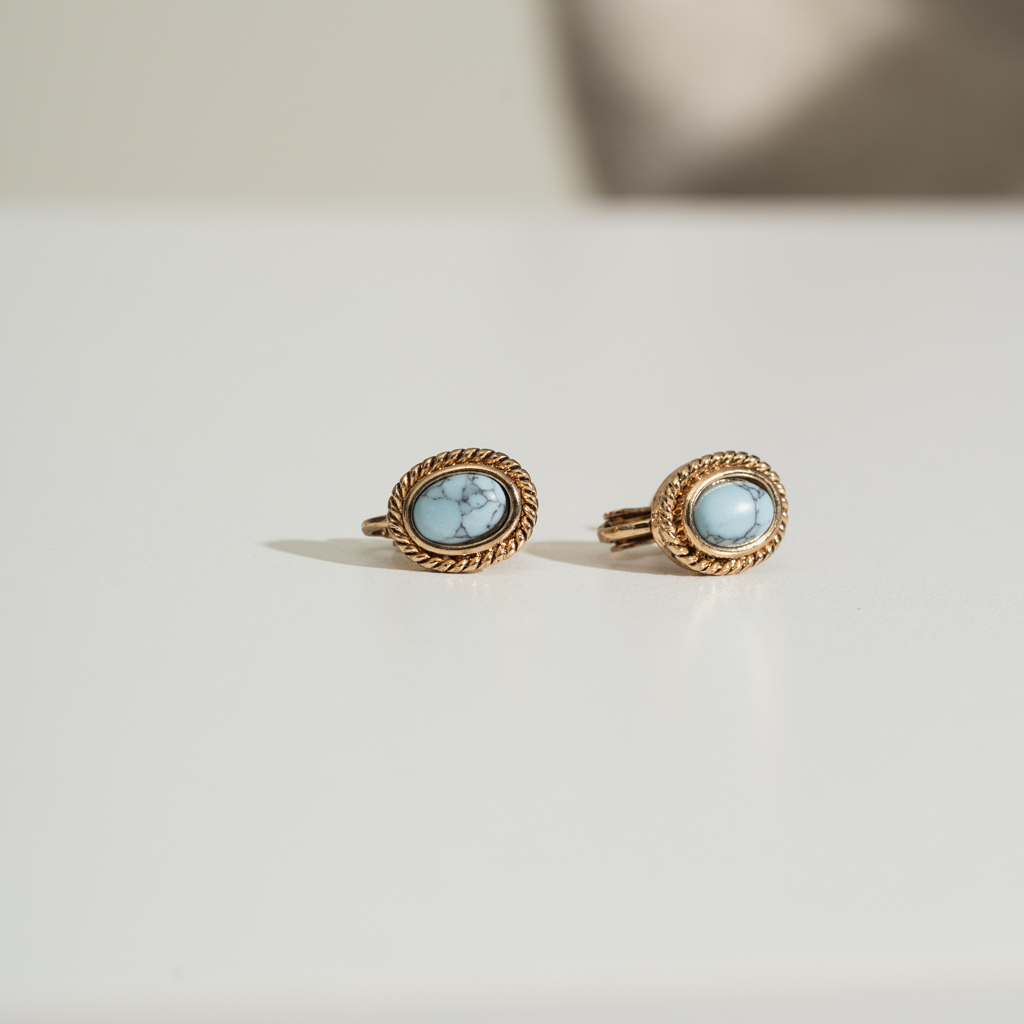 復古麻花大理石紋.螺旋夾式耳環 -白色/藍色