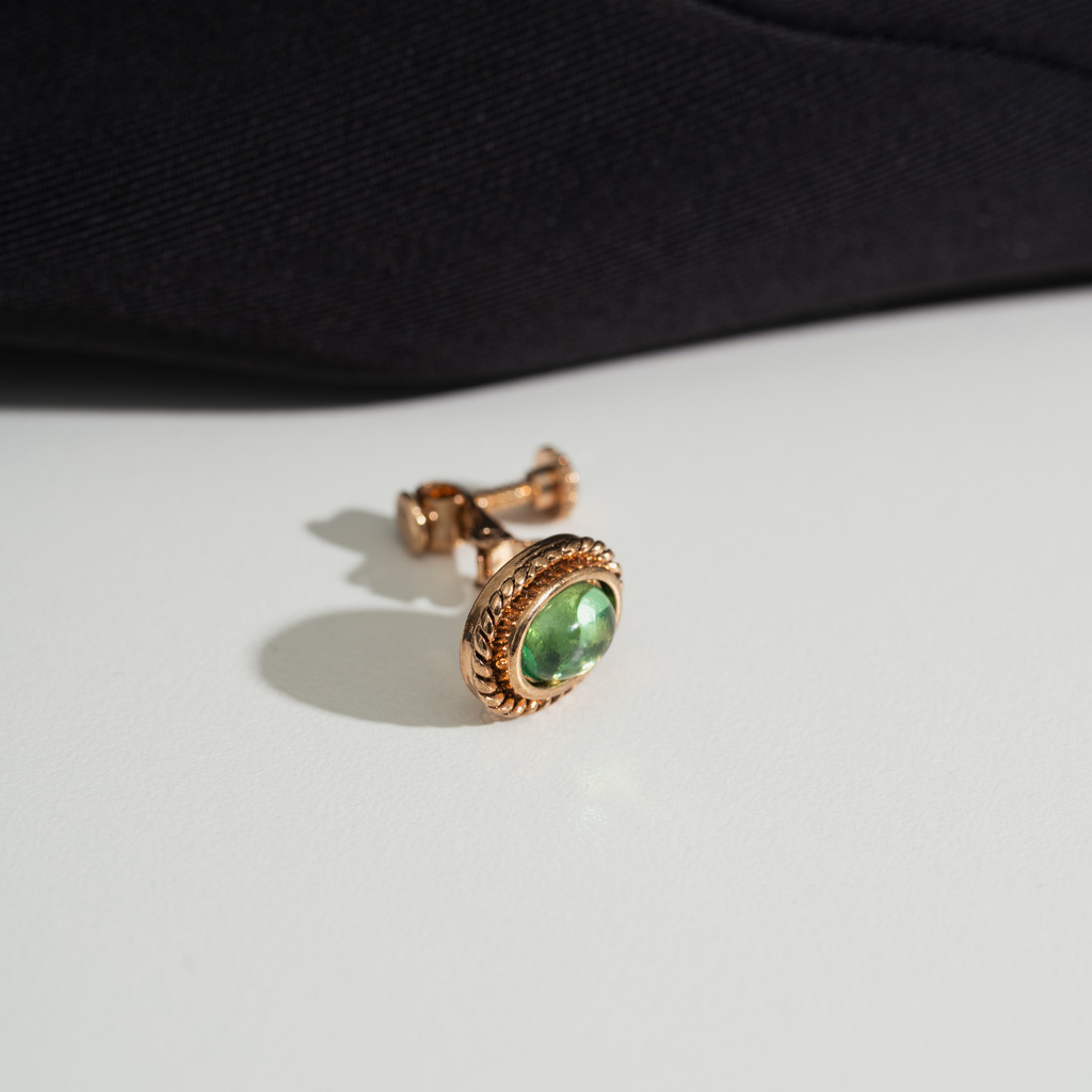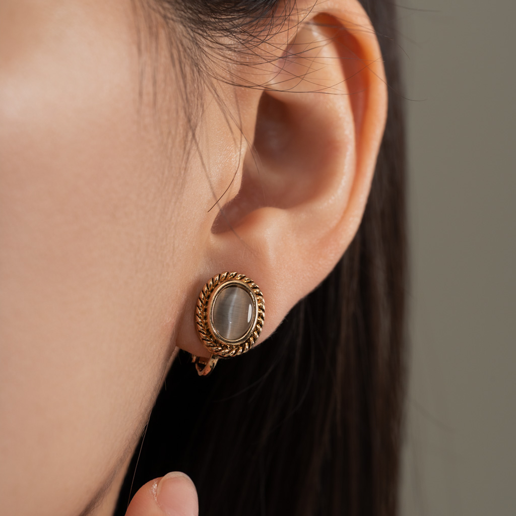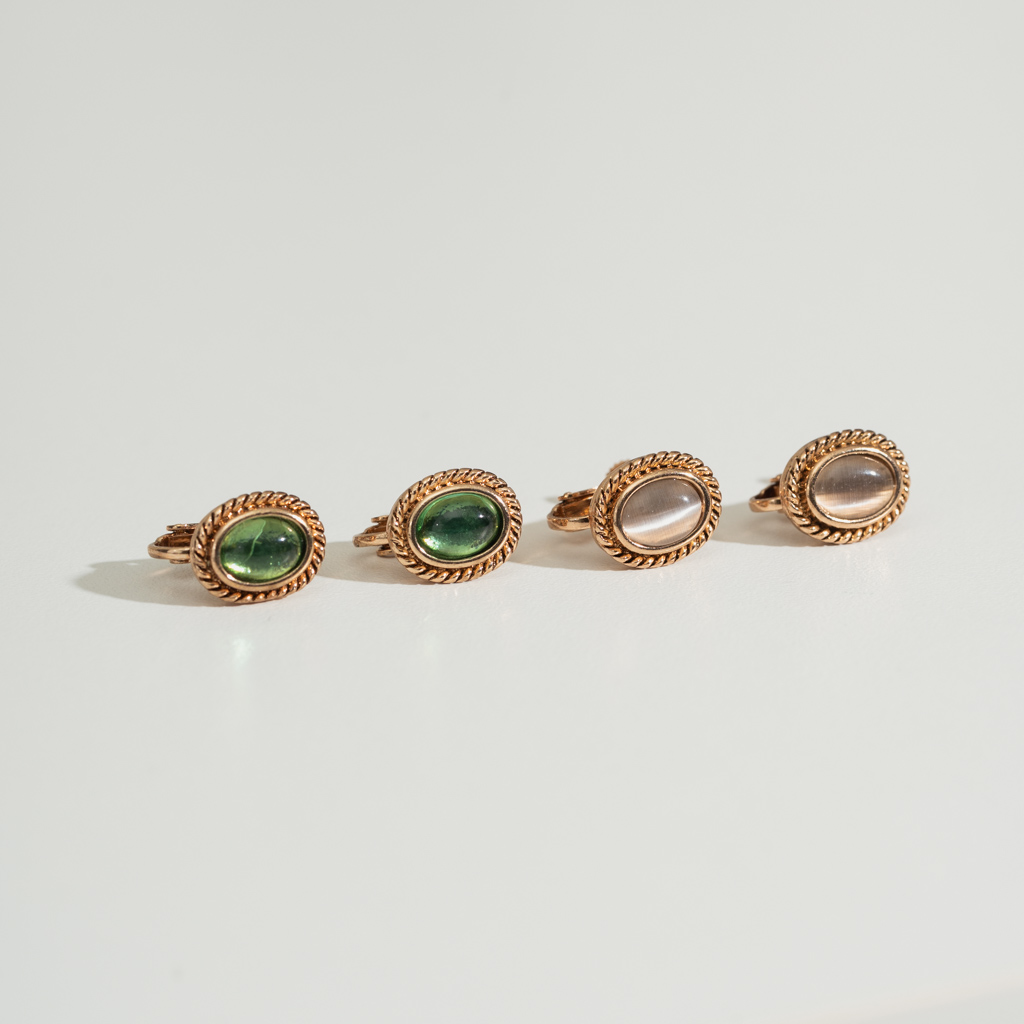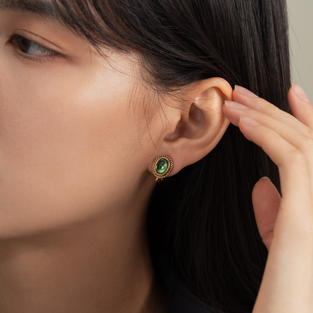 復古橢圓貓眼.螺旋夾式耳環 -綠色/灰色