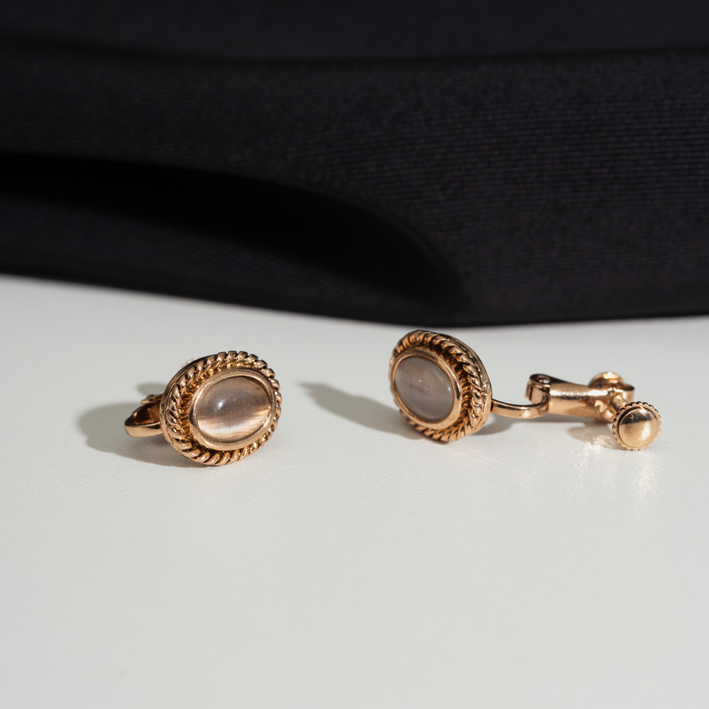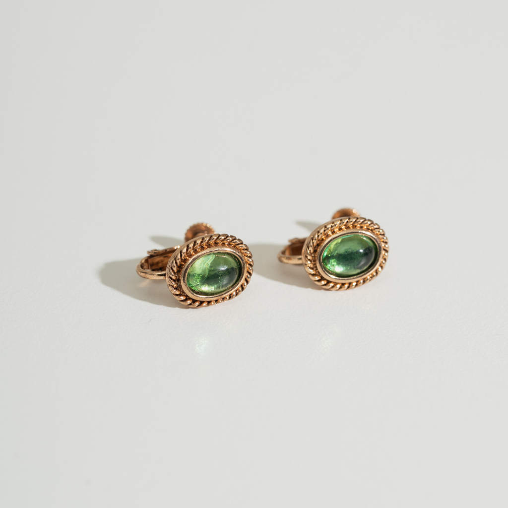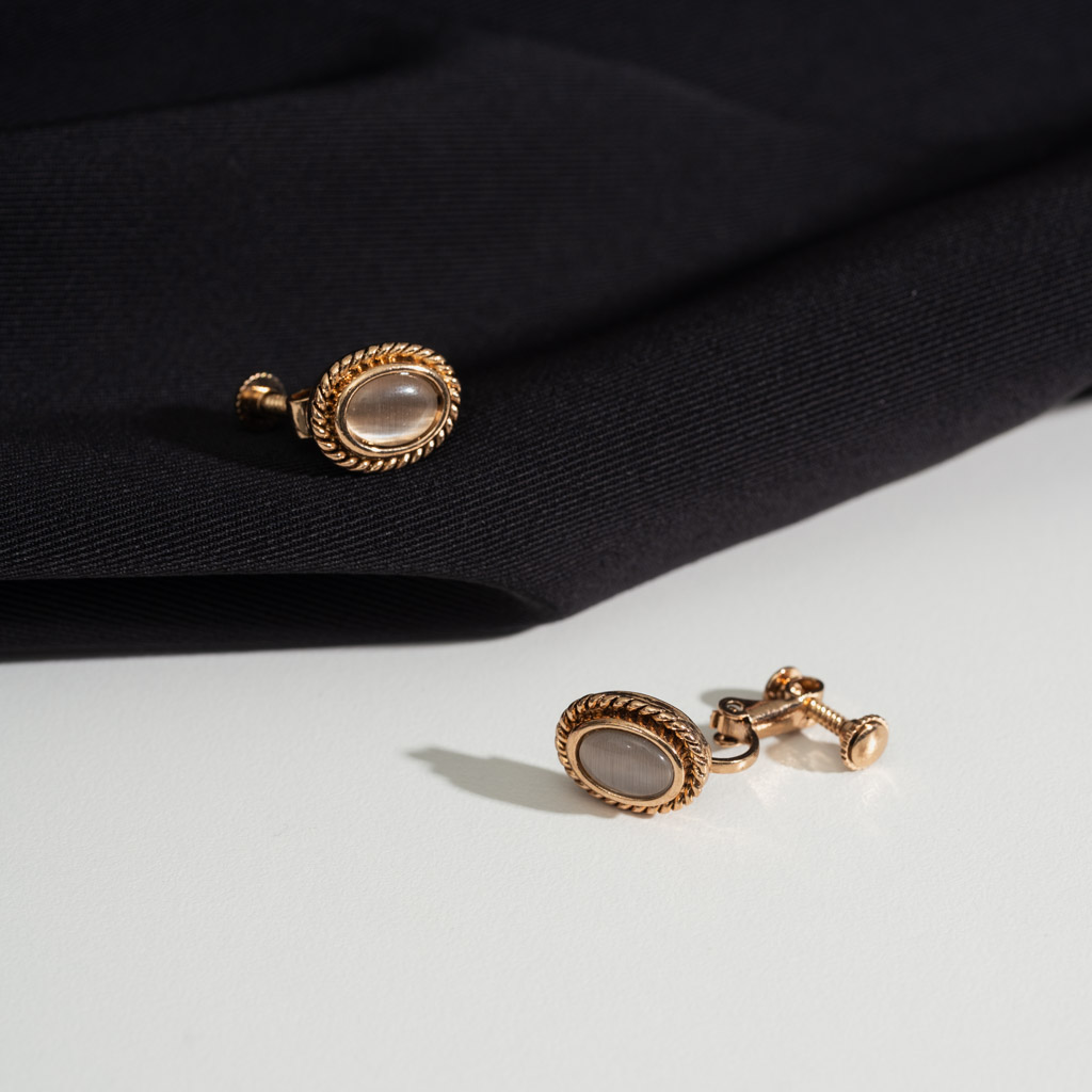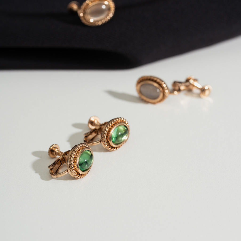 復古橢圓貓眼.螺旋夾式耳環 -綠色/灰色