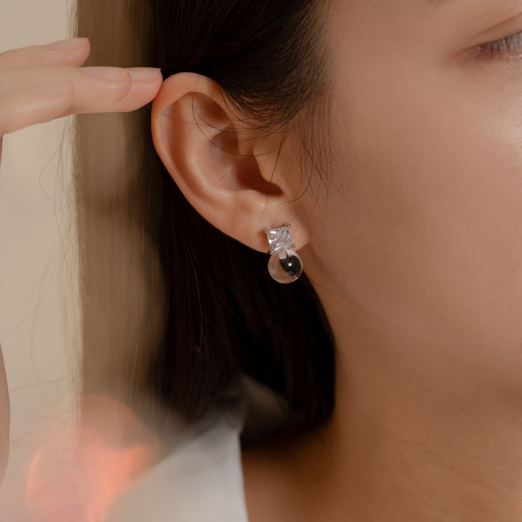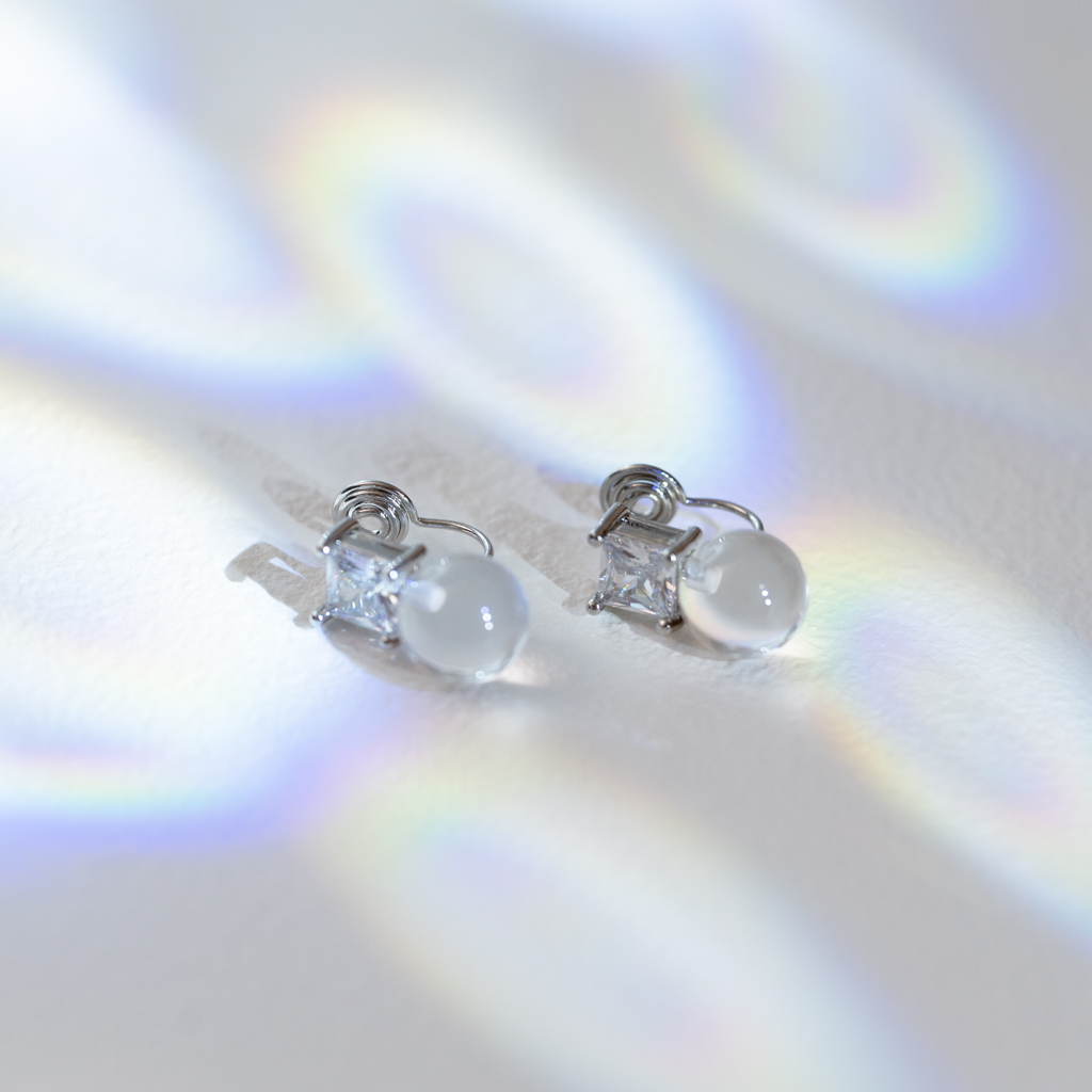 方鑽透明感玻璃珠.蚊香盤耳夾 - 銀色