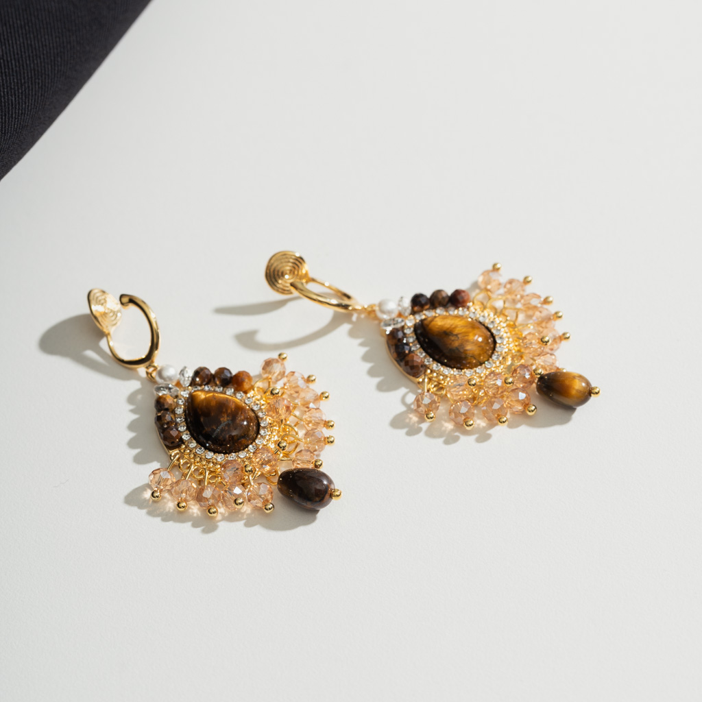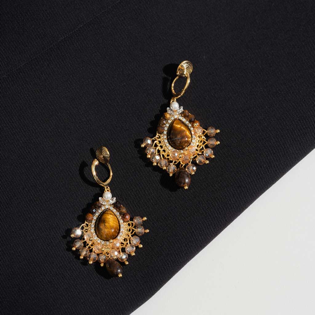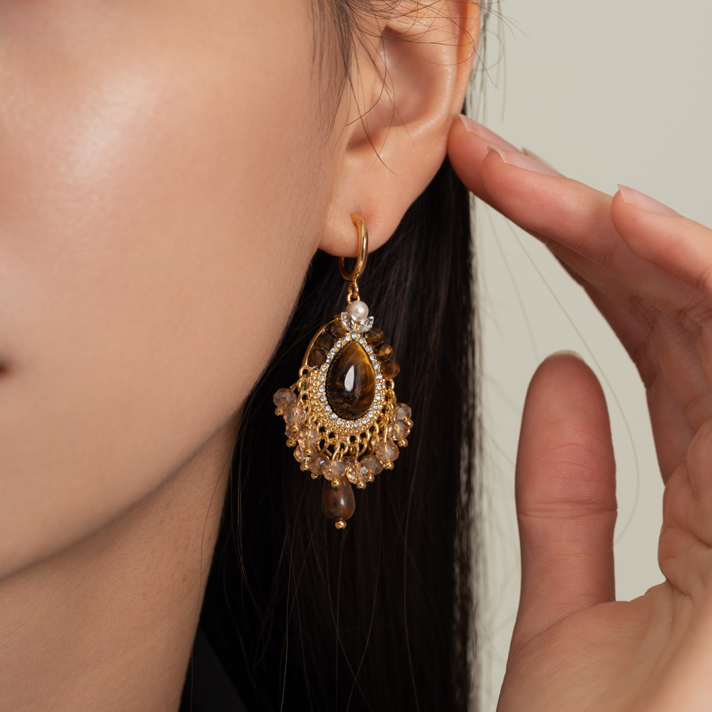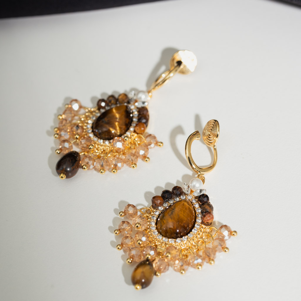 復古琥珀垂墜仿水晶.蚊香盤耳夾 - 棕色