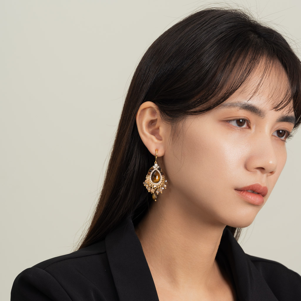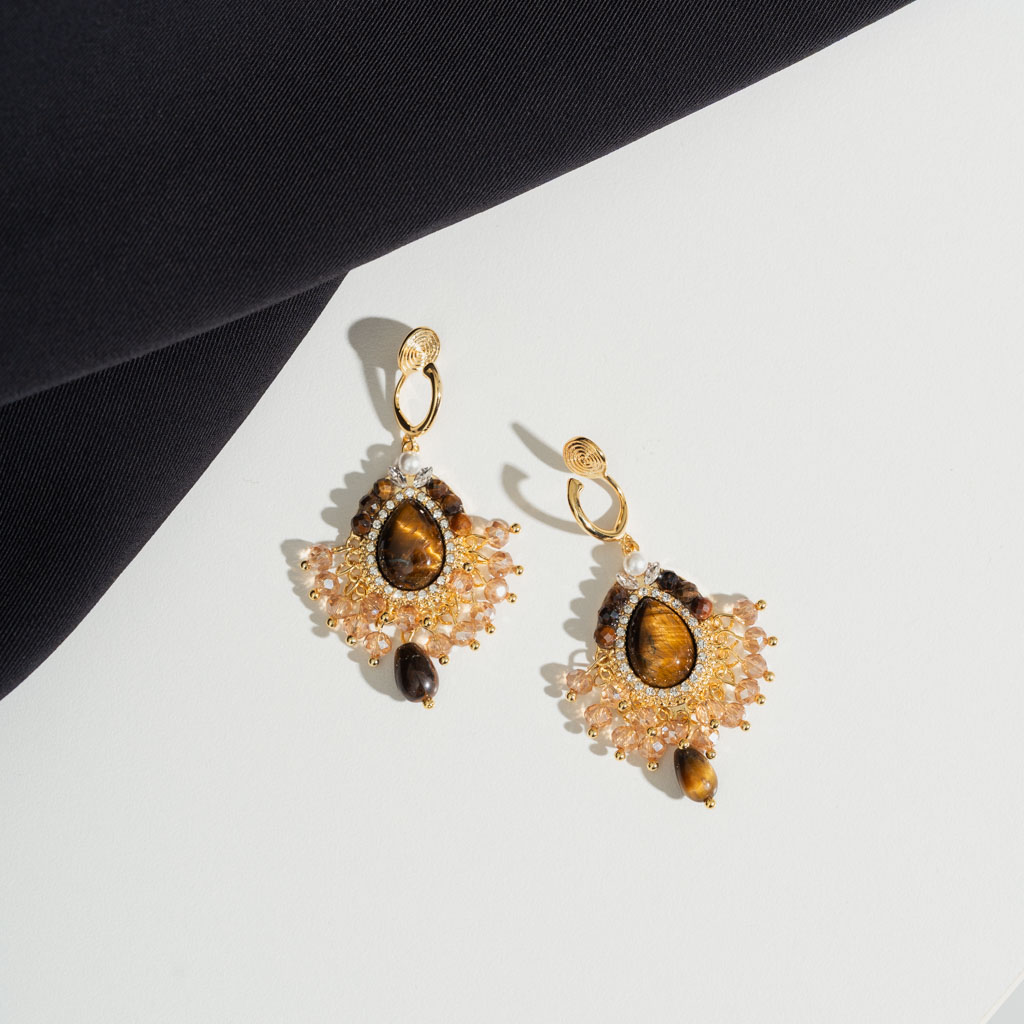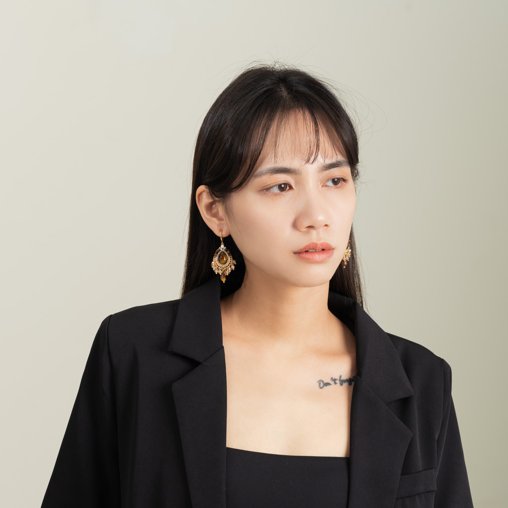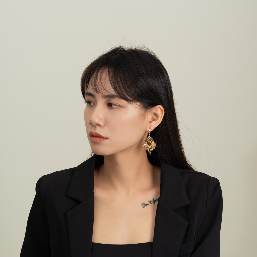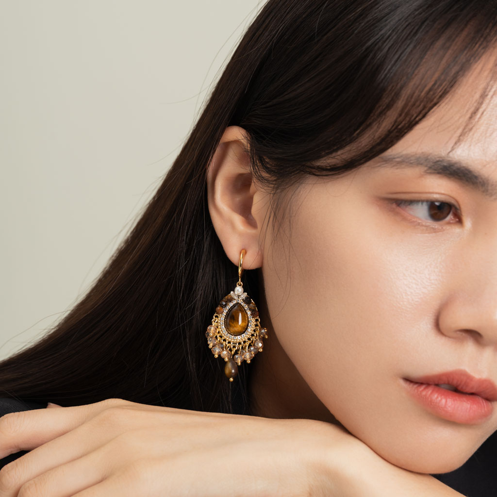 復古琥珀垂墜仿水晶.蚊香盤耳夾 - 棕色