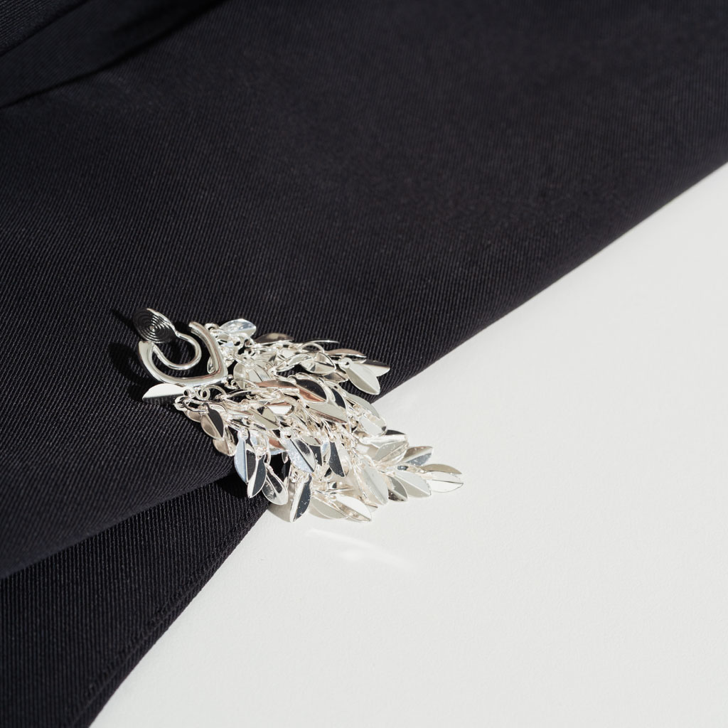 銀色葉片層層堆疊,在光線下閃出細緻金屬光澤