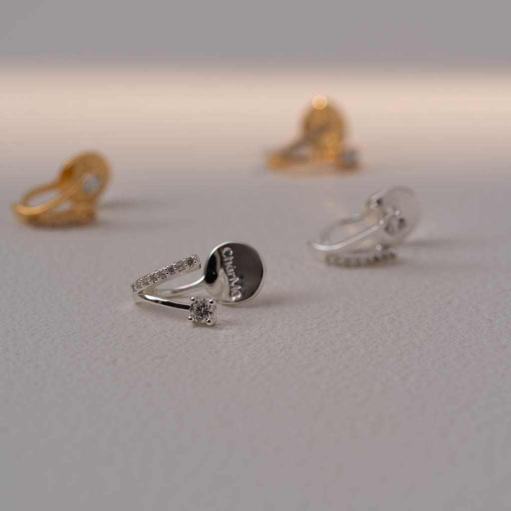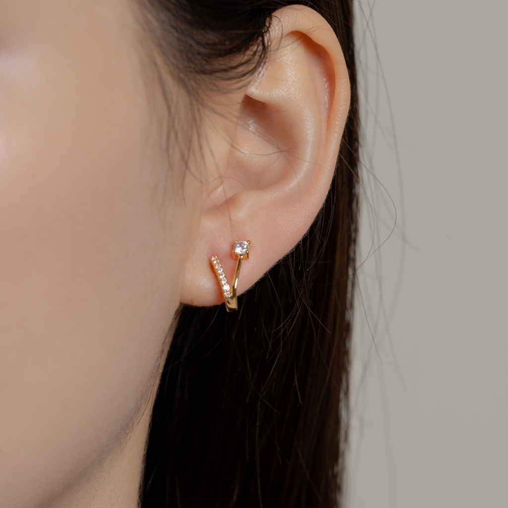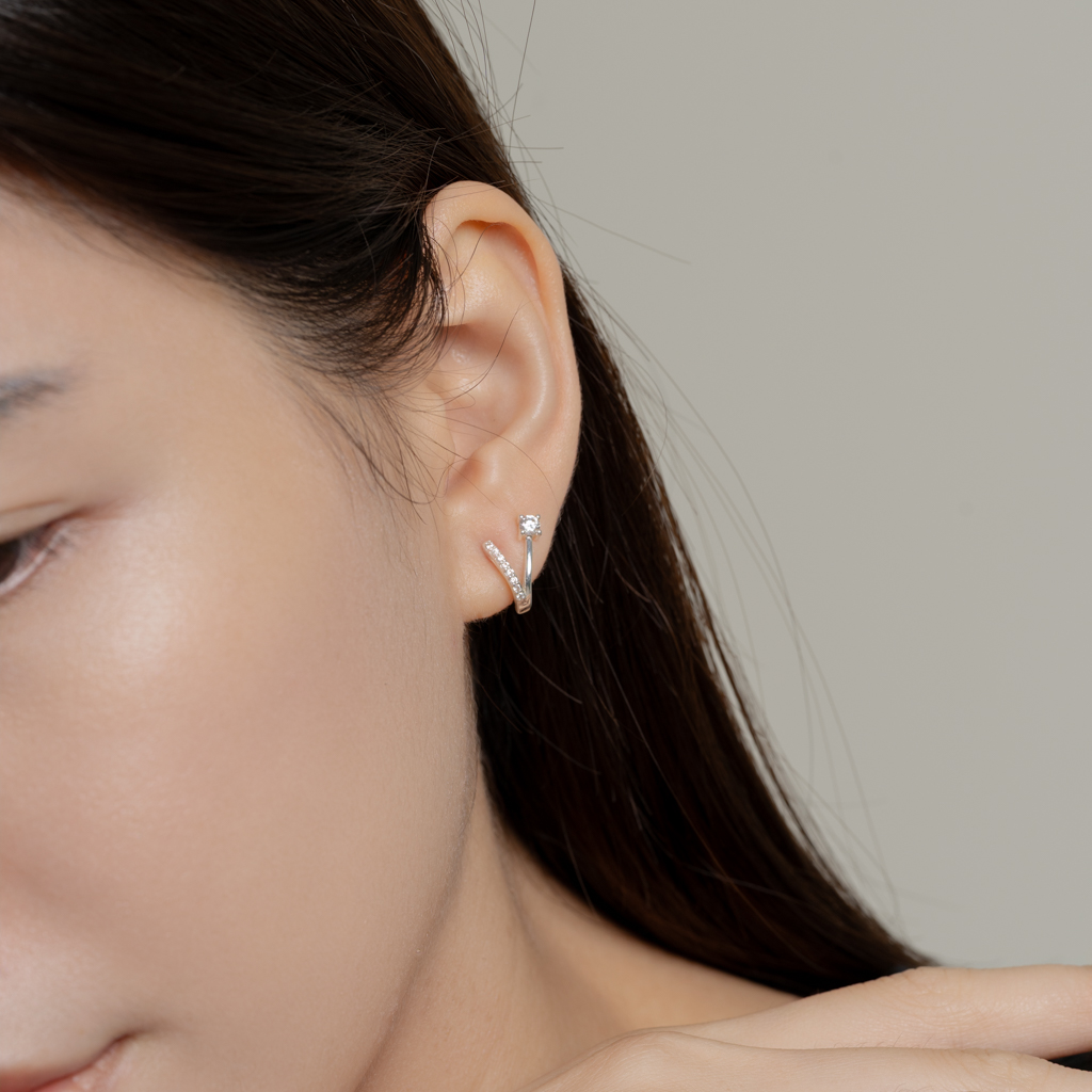 自訂款 | 單鑽小V排鑽線條.蚊香盤耳夾 - 銀色/金色