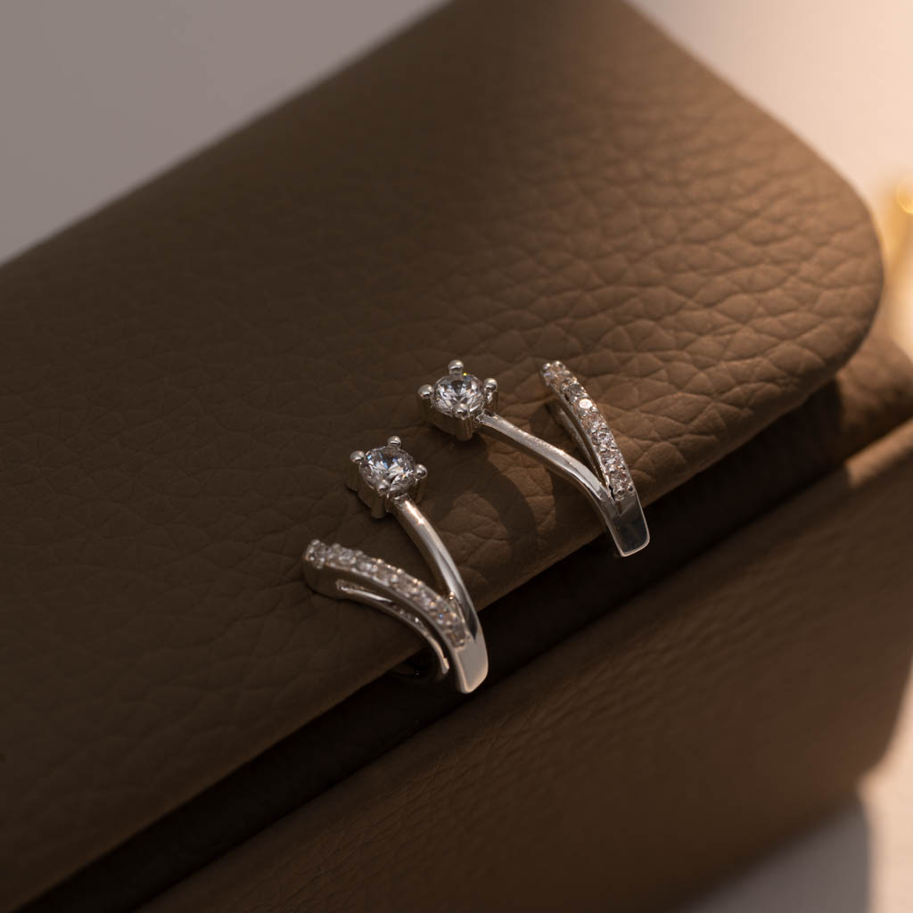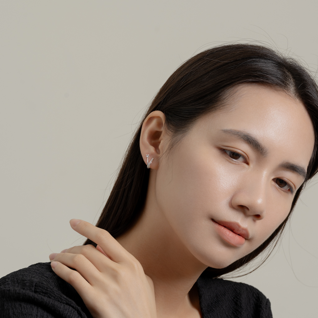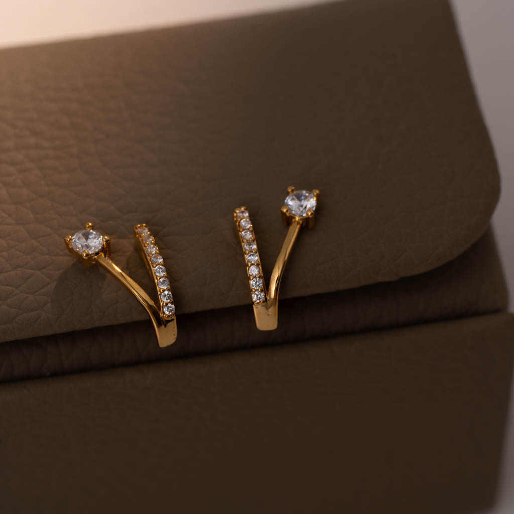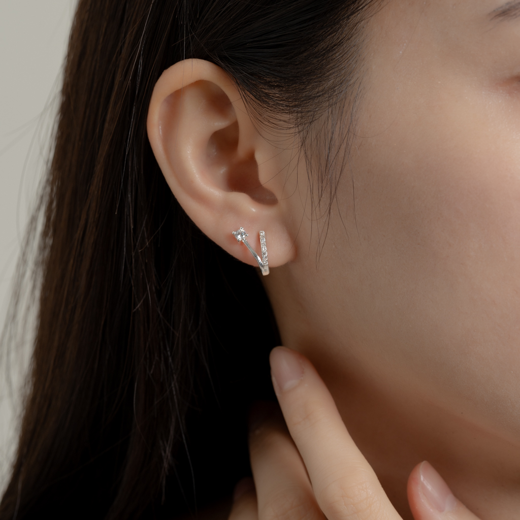 自訂款 | 單鑽小V排鑽線條.蚊香盤耳夾 - 銀色/金色
